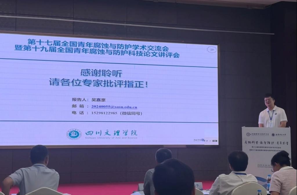 8月29日至31日,威廉希尔(WilliamHill)教师吴嘉豪博士参加了在四川省南充市举办的“第十七届全国青年腐蚀与防护学术交流会暨第十九届全国青年腐蚀与防护科技论文讲评会”。