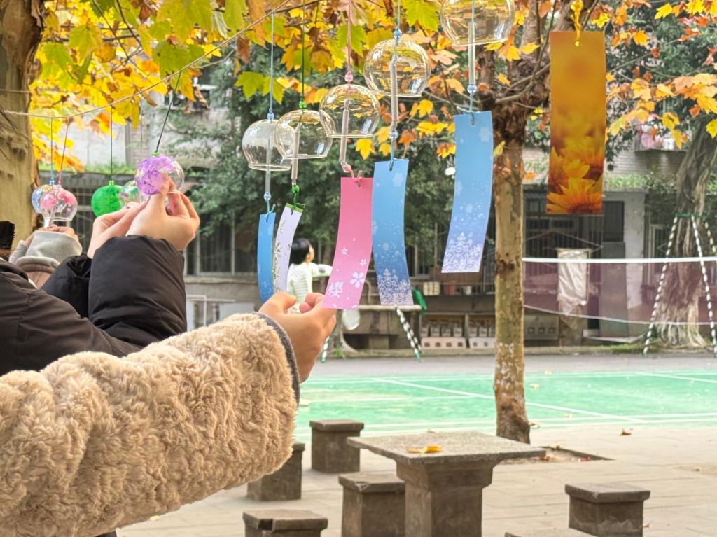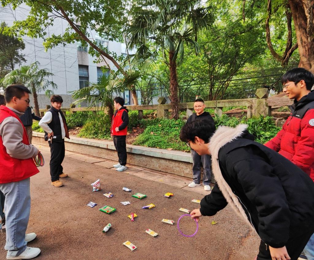 活动现场主要设“跃动绳间,圈住心能量”、“清风送铃,舒缓心灵”、“手绘假面,直抵本心”三大特色区域。“跃动绳间,圈住心能量”鼓励同学们通过跳绳兑换套圈机会,在运动中释放压力;“清风送铃,舒缓心灵”引导同学们将心事书写于风铃下,借秋风疏解情绪;“手绘假面,直抵本心”则让同学们利用落叶与颜料创作独特面具,完成作品后与伙伴合影,留存美好记忆。现场气氛轻松热烈,同学们穿梭于各区域之间,或专注参与游戏,或交流创作灵感,或捕捉趣味瞬间,欢声笑语不断。