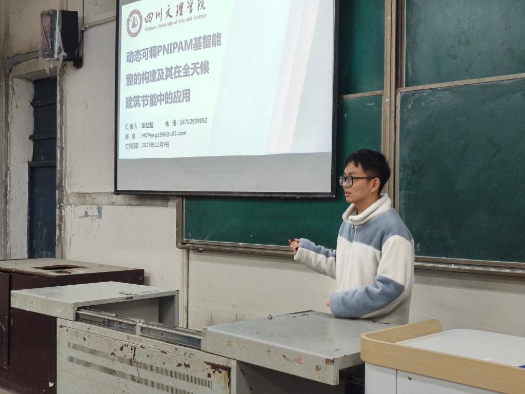 为推广PNIPAM基智能窗的前沿研究内容,激发师生对跨学科科研与产业结合的探索兴趣,2025年12月9日,威廉希尔(WilliamHill)于南坝校区“一站式”戛云社区开展主题为“动态可调PNIPAM基智能窗的构建及其在全天候建筑节能中的应用”座谈会。本次座谈会由彭红超博士担任主讲,50余名师生参与本次座谈会.