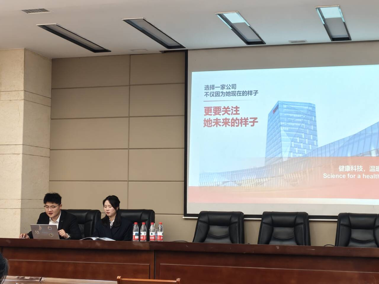 会议伊始,颜经理详细介绍了正大天晴药业集团股份有限公司。作为中国生物制药核心企业、国家重点高新技术企业,公司是集药品研发、生产与销售于一体的创新型医药集团,位居中国医药工业百强前列,在肿瘤、肝病、呼吸等领域具备显著行业优势。随后,颜经理围绕企业概况、核心业务、研发实力、人才培养体系及未来发展方向展开全面讲解,为同学们深入了解行业头部企业提供了详实信息。紧接着,颜经理提出,公司持续深化校企合作,面向高校毕业生开放了营销、生产、质量、研发等多类岗位,涵盖学术专员、临床监查员、合成研究员等优质职位,为同学们搭建了多元、畅通的职业发展平台。