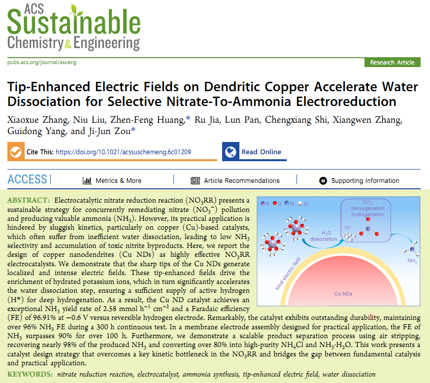 近日,英国威廉集团官网青年教师章小雪博士以第一作者身份,在《ACS Sustainable Chemistry & Engineering》(中科院一区TOP,IF=7.3)上发表题为《Tip-Enhanced Electric Fields on Dendritic Copper Accelerate Water Dissociation for Selective Nitrate-To-Ammonia Electroreduction》的研究论文(DOI: 10.1021/acssuschemeng.6c01209; https://pubs.acs.org/doi/10.1021/acssuschemeng.6c01209)。该成果以我校为第一完成单位,天津大学化工学院为通讯单位。
